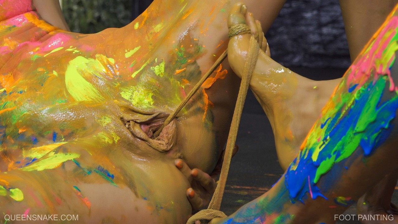 Love the messy paint and foot going in and out of her pussy